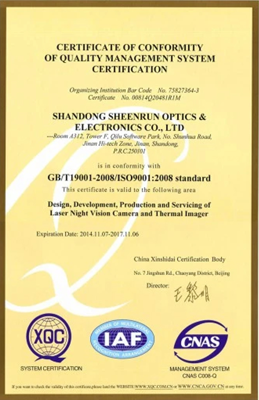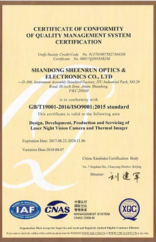 Shandong Sheenrun Optics & Electronics Co., Ltd, which was founded in 2004, is a leading long range night vision equipment and thermal imaging camera equipment supplier. as well as a relying construction company of Shandong Province Academician Workstation and Night Vision Surveillance Engineering Technology Research Center. Sheenrun adheres to independent innovation, developed laser night vision camera and uncooled continuous zoom infrared thermal imaging camera with independent intellectual property rights, its synchronous zoom laser night vision technology and continuous zoom thermal imaging technology have reached standard level.